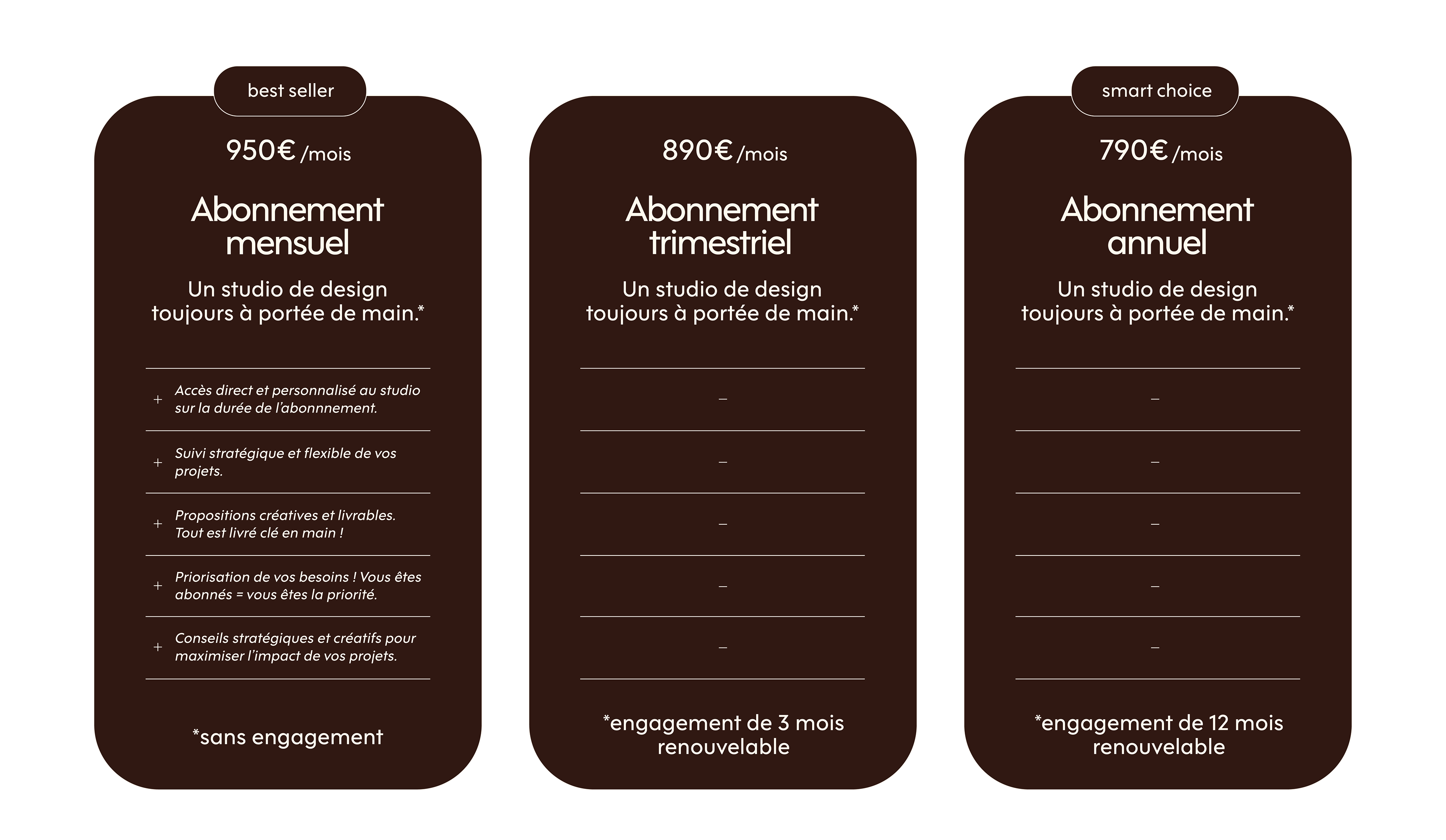 Vous souscrivez, et le studio devient votre partenaire design externe, disponible pour tous vos besoins graphiques.