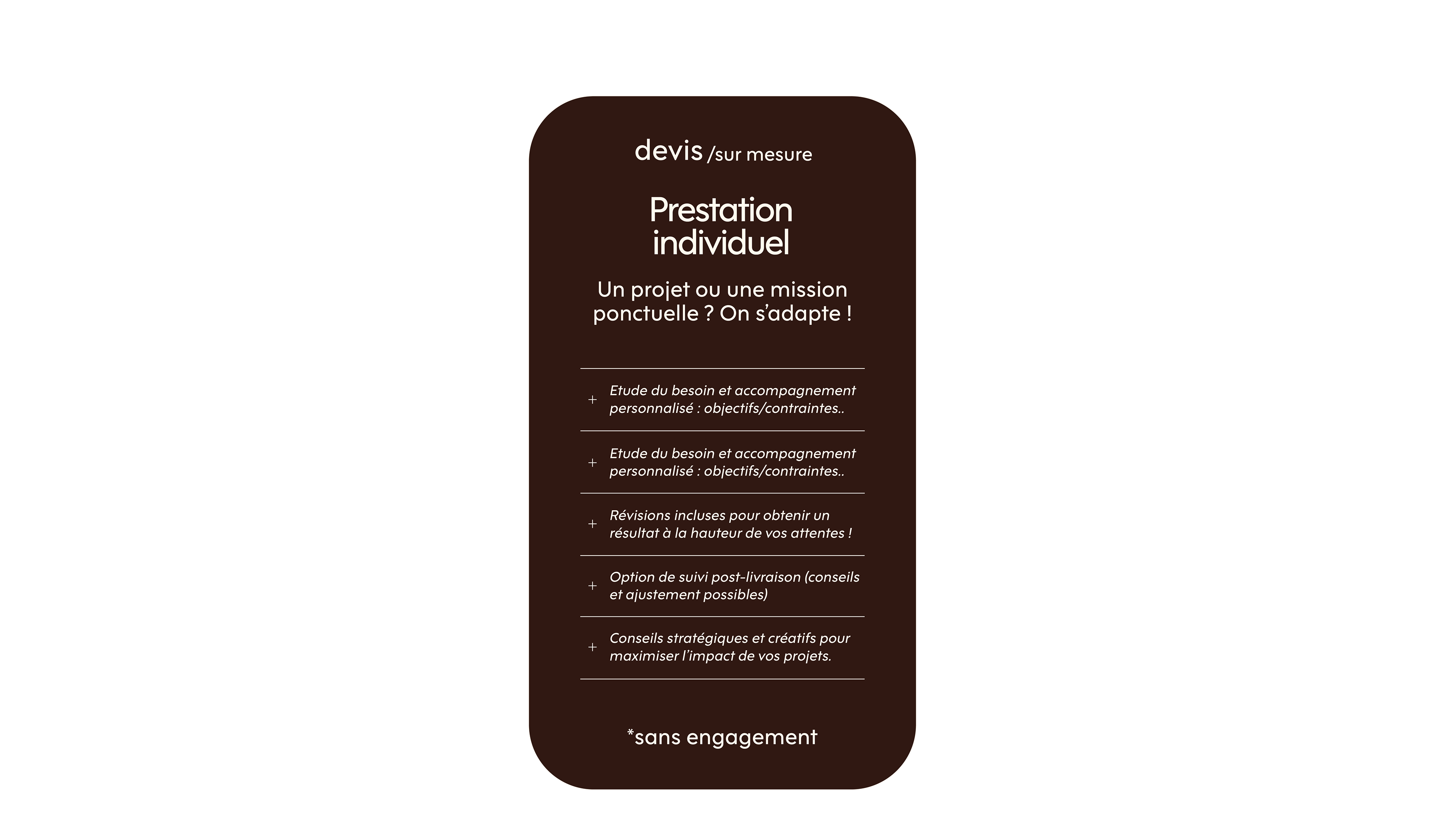 Le studio intervient également sur vos projets ponctuels, avec un accompagnement sur-mesure de A à Z.
